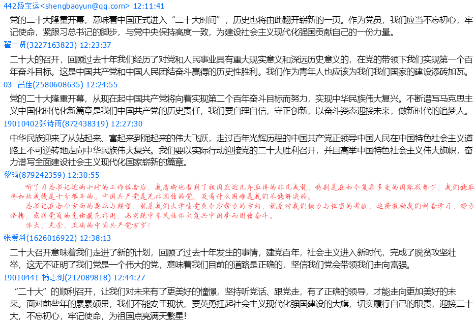 武器发射工程专业党支部全体党员在党的二十大开幕会的这一天深深地体会到了中国共产党坚持真理、坚守理想,践行初心、担当使命,不怕牺牲、英勇斗争,对党忠诚、不负人民的伟大建党精神。通过学习,支部党员更加明确了自己所担负的历史责任,时刻准备党和人民牺牲一切,为中华民族伟大复兴的中国梦贡献出自己的力量。