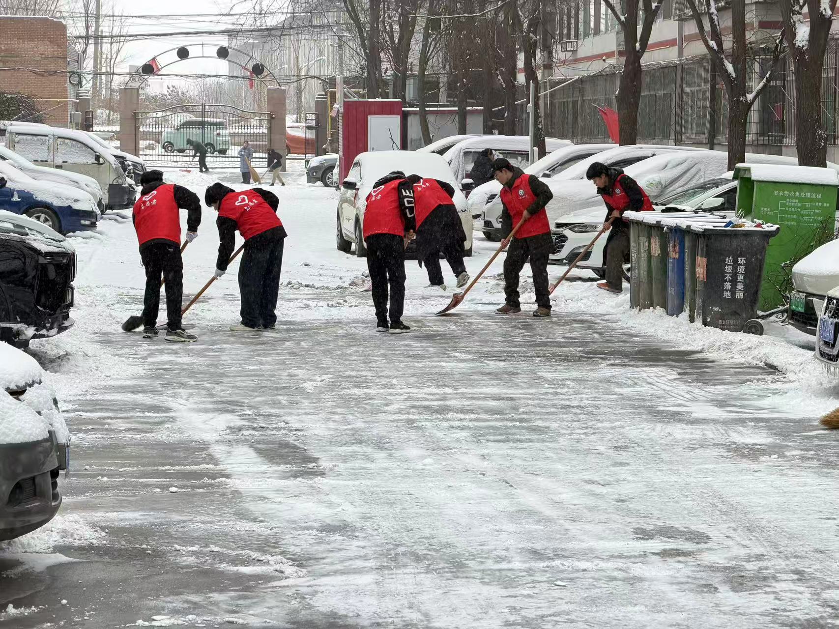 师生迅速响应,通过线上号召快速集结40名青年志愿者。同学们不畏严寒,手持铁锹、雪铲等工具,顶风冒雪赶赴社区,重点对居民小区主次干道、单元门口、便民通道等关键通行区域开展除雪工作。