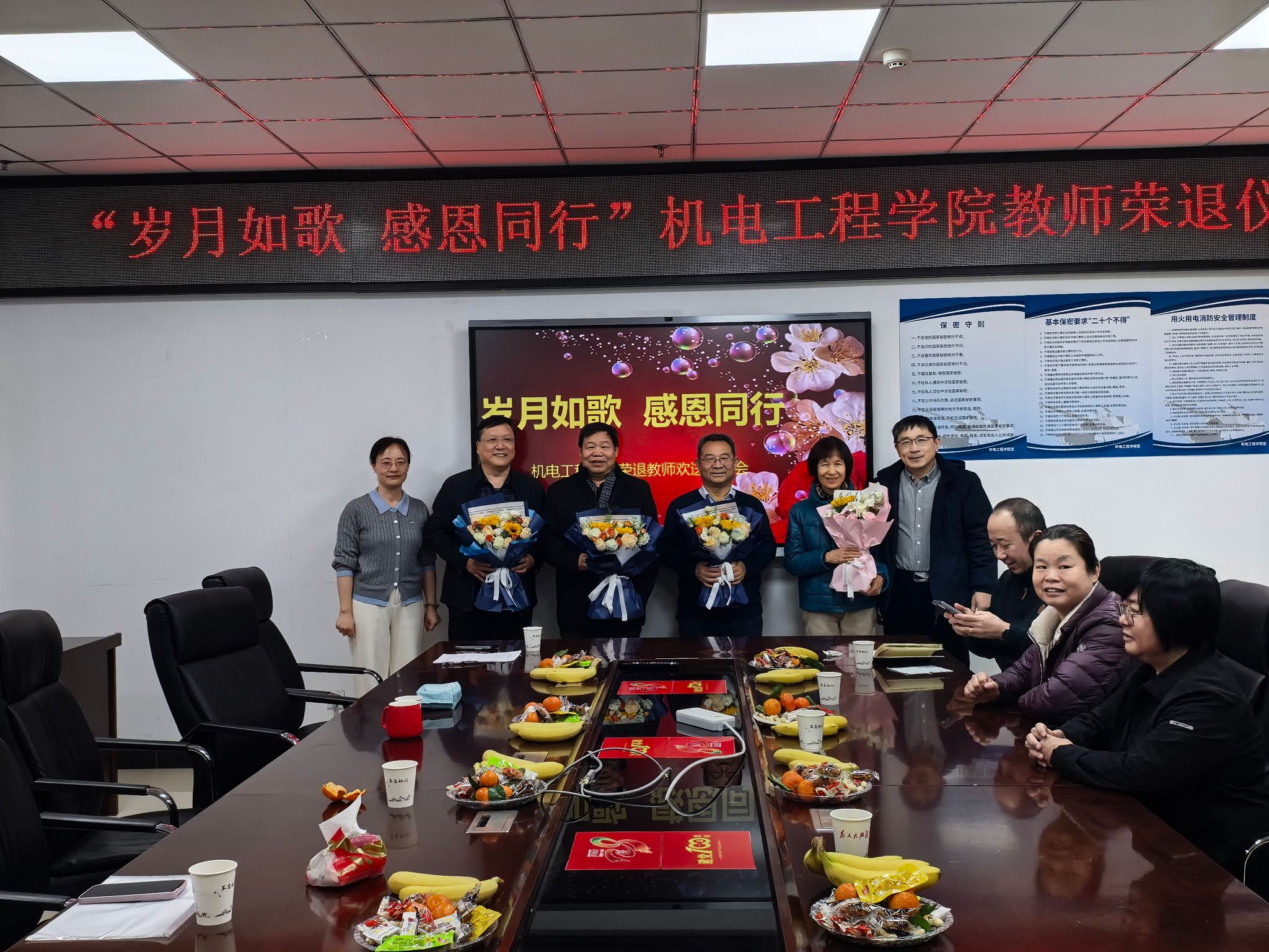 在313会议室为陈国光教授、智小琦教授、焦国太教授、高建彪老师隆重举行“岁月如歌,感恩同行”教师荣退仪式,院党委副书记田海燕主持仪式,院党委书记赵河明、副院长李世中出席并致辞,各专业教师代表参加仪式。